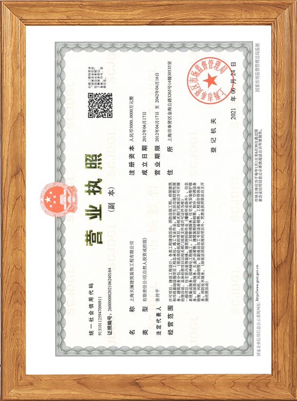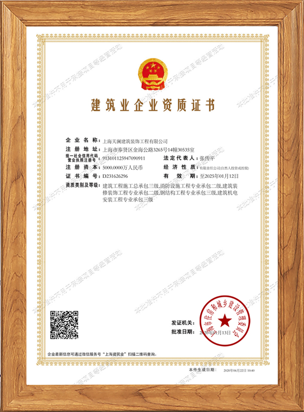 上海天瀾建筑裝飾工程有限公司由熱愛裝修事業的專業人士創辦,經上海工商行政管理局注冊登記的專業上海工裝公司。天瀾建筑裝飾注冊資本5000萬,擁有建筑施工總承包三級,鋼結構工程專業承包三級建筑裝飾工程專業承包二級,建筑機電設備安裝專業承包三級,消防設施工程專業承包二級等資質。國家建筑裝飾裝修工程設計與施工二級資質單位、上海市建筑裝飾裝修行業協會會員單位、有上海市建設和交通委員會頒發的“安全生產許可證”。