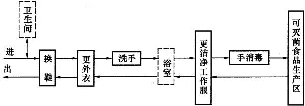 5.4.3 可滅菌食品生產區人員凈化程序宜按圖5.4.3順序安排。